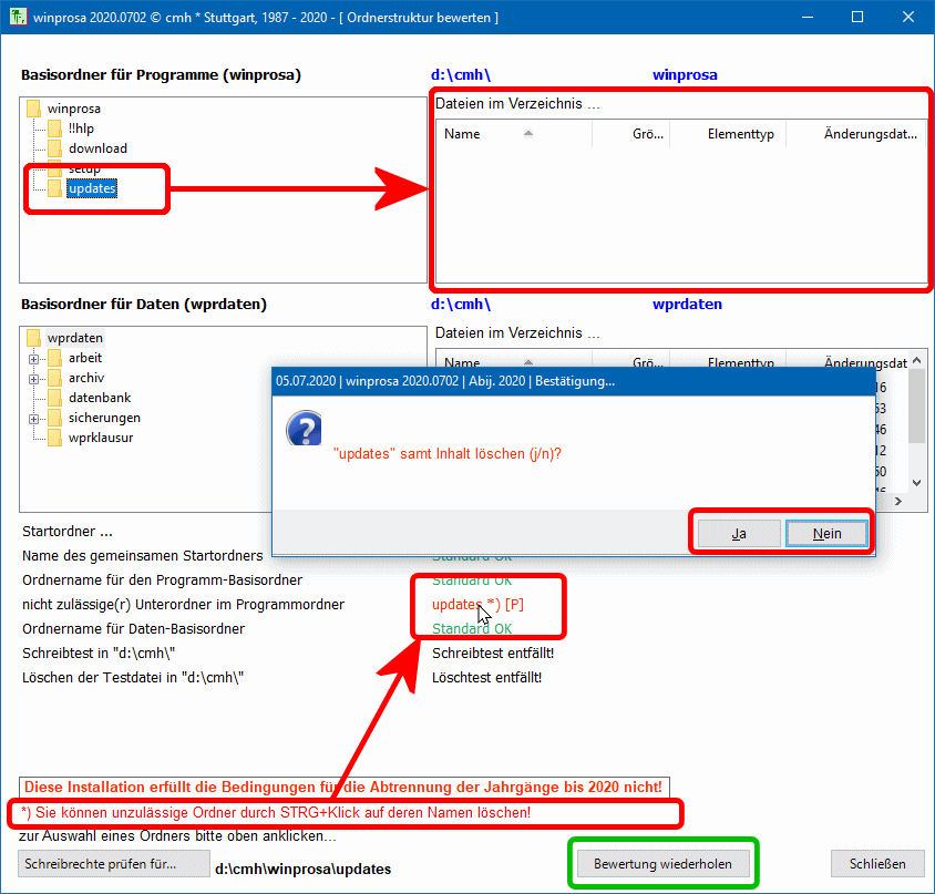 Das Splitting-Update (Herbst 2020) wird im Ordner cmh u.a. einen neuen Ordner wpr20 anlegen. Daher braucht winprosa auf dieser Ebene Schreibrechte. Dies wird automatisch überprüft und das Ergebnis im Feld 2 angezeigt.
