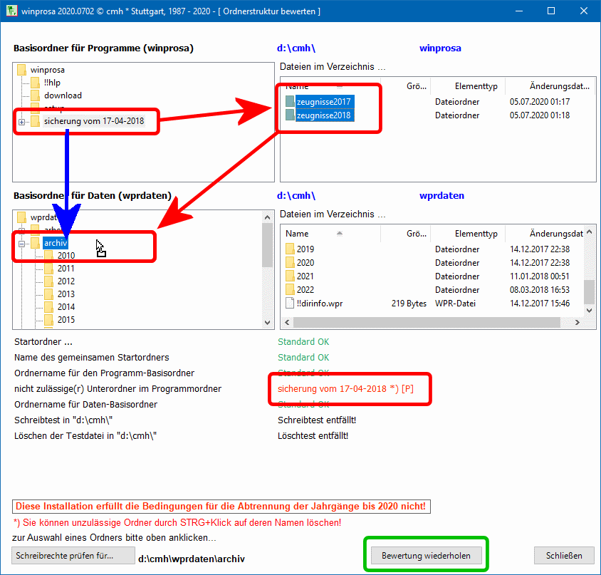 Im Bild wird unten in der Bewertungsliste angezeigt (blau markiert), dass das alte Anwendungs-Archiv 2004-2009 (archiv_bis2009) an der üblichen Stelle nicht gefunden wurde. Nach dem Splitting-Update im Herbst 2020 wird dort auch das Anwendungs-Archiv 2010 - 2020 aufgeführt sein (= Ordner …\cmh\wpr20).
