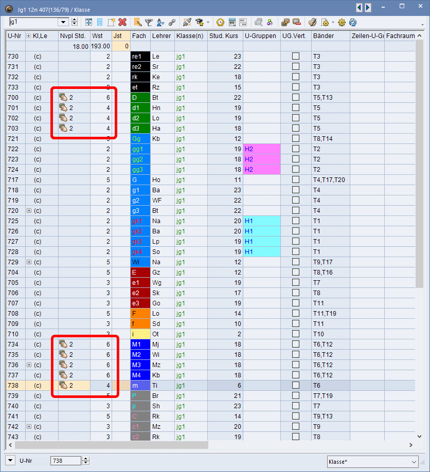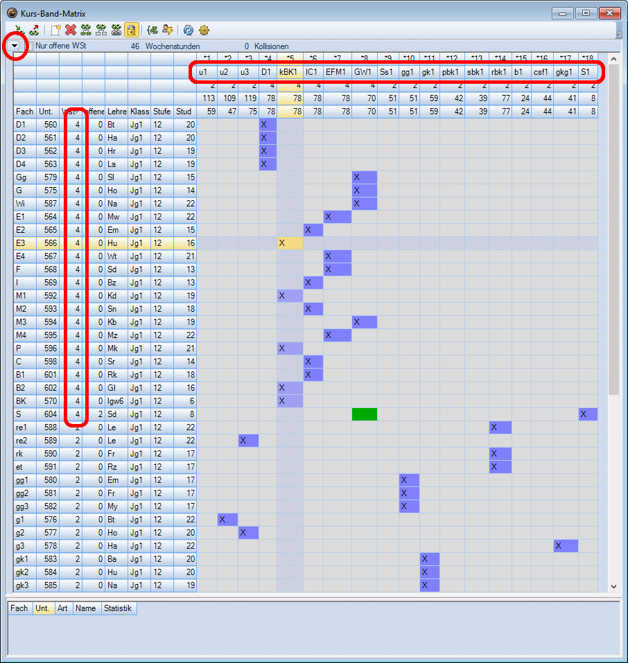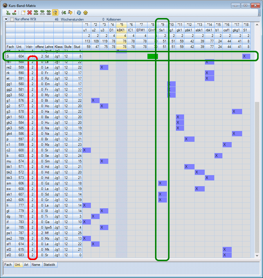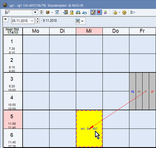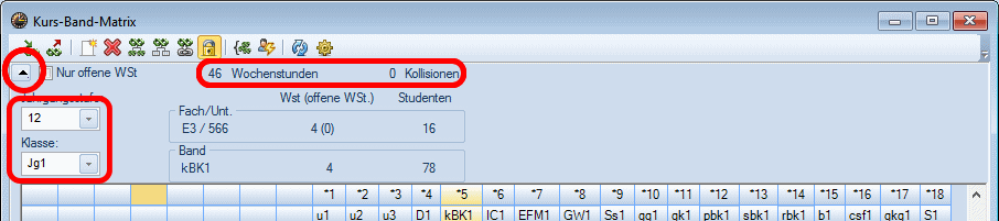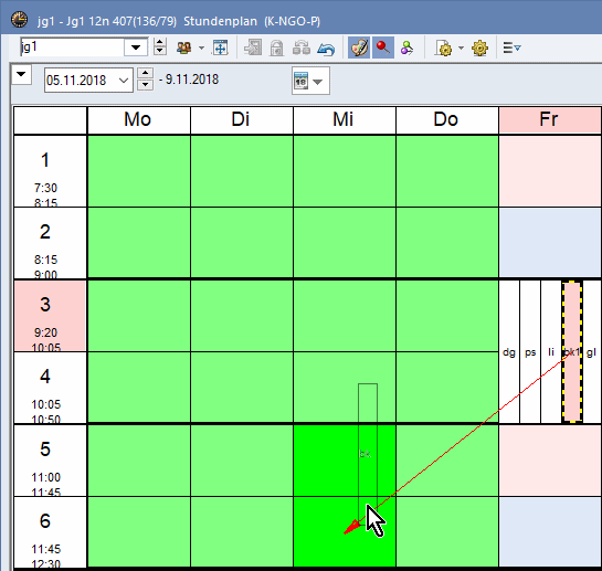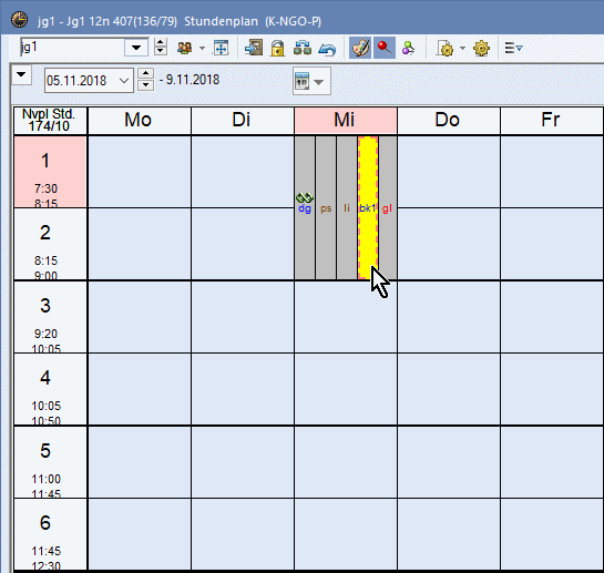 - Erhöhen Sie die Plantakte derjenigen Kurse um 1, die in einer MWO-Doppelstunde verplant werden sollen. Dadurch entsteht in jedem der betroffenen Bänder eine unverplante Stunde.