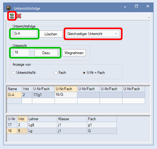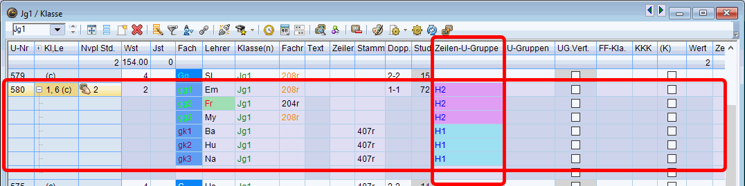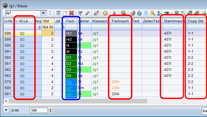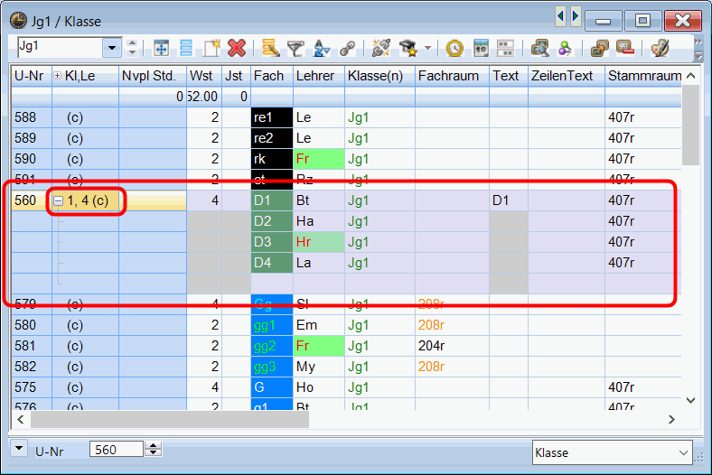 - Bei einem gekoppelten Unterricht (mehrere Lehrer, Räume, Fächer und Klassen) finden die beteiligten Unterrichte gleichzeitig statt, für sie sind in der Regel nur Klassen benannt, aber keine einzelnen Schüler.
