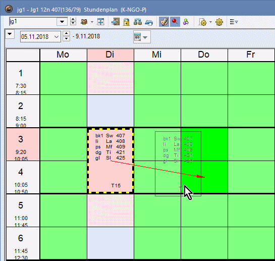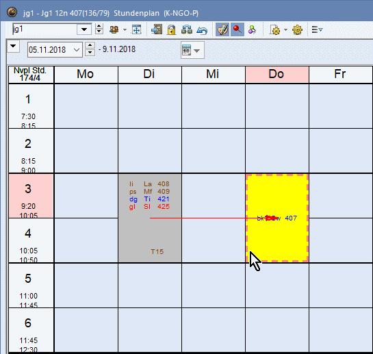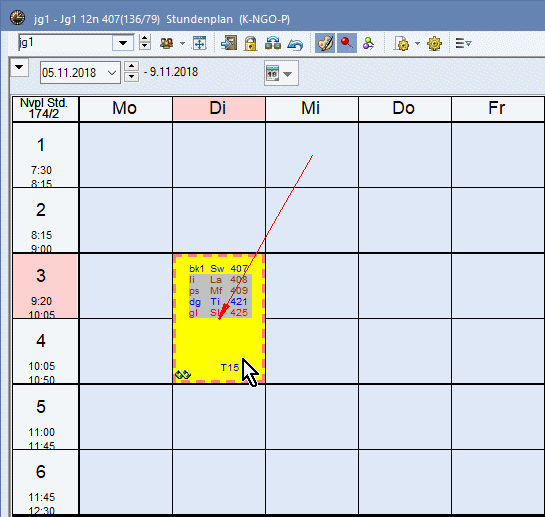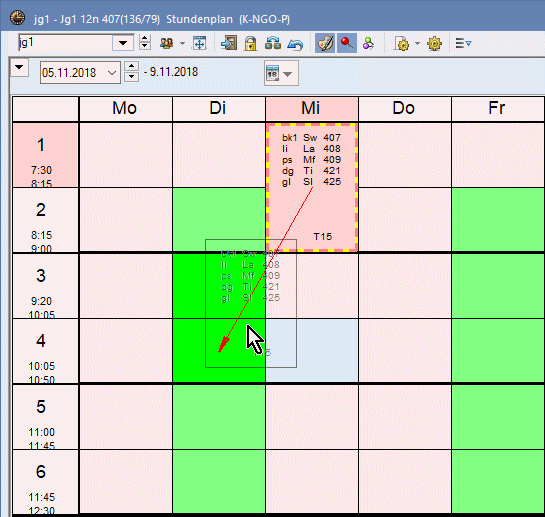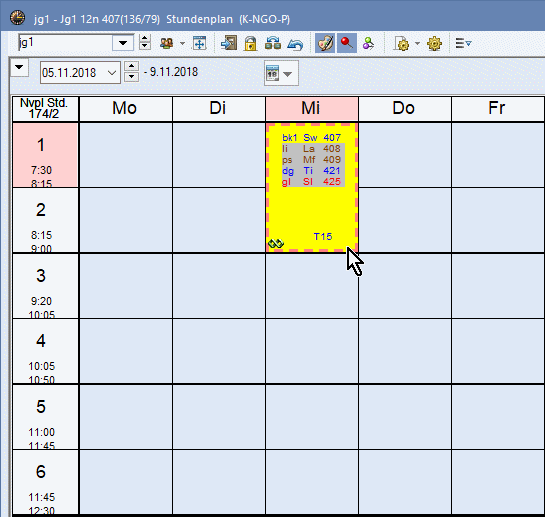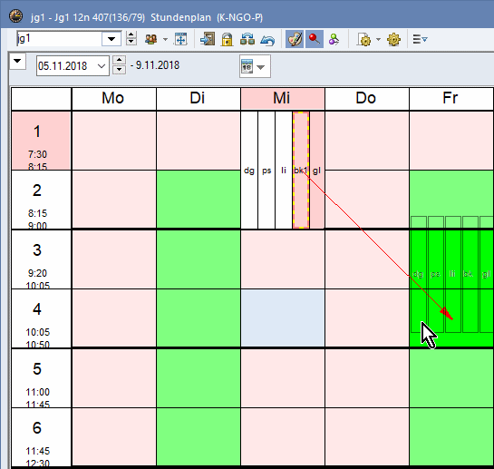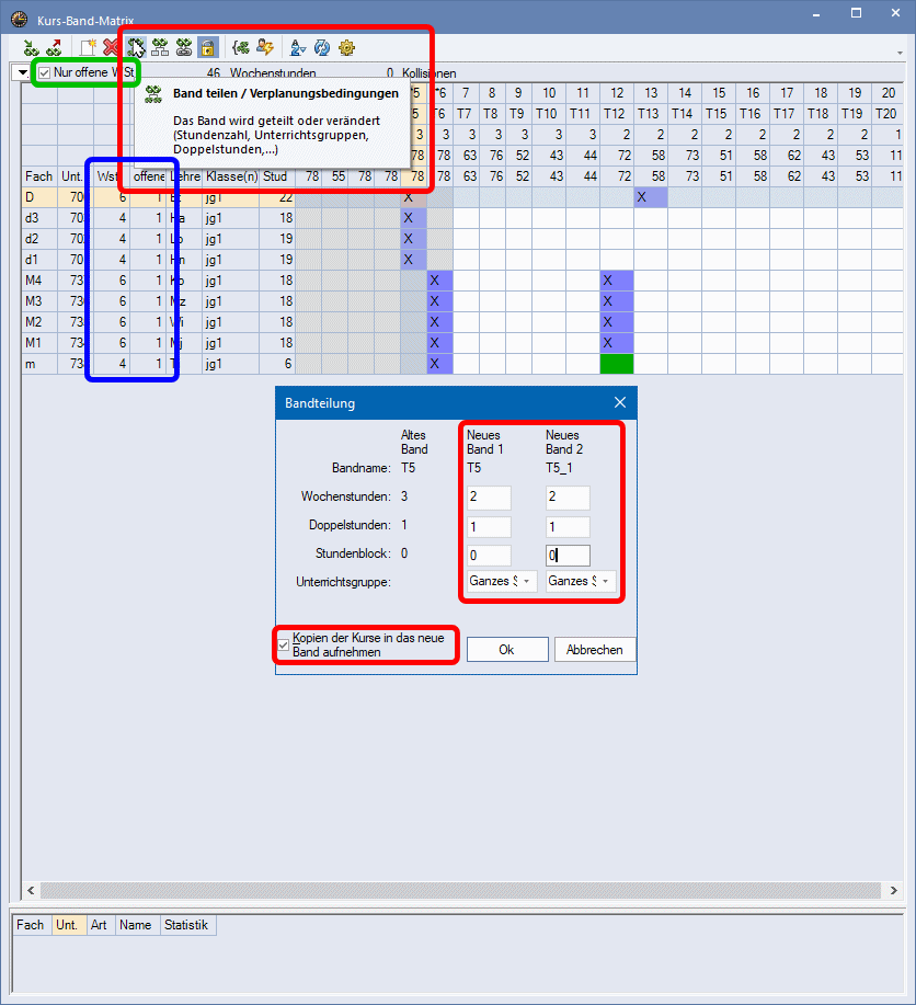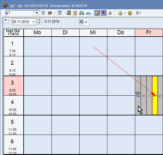 - Löschen Sie der Reihen nach aus jedem dieser Bänder alle dort eingetragenen Kurse und buchen diese in das nun leere Band wieder ein. Dadurch haben diese Bänder nun eine Stunde mehr verplant und es gibt dort keine unverplanten Stunden mehr.