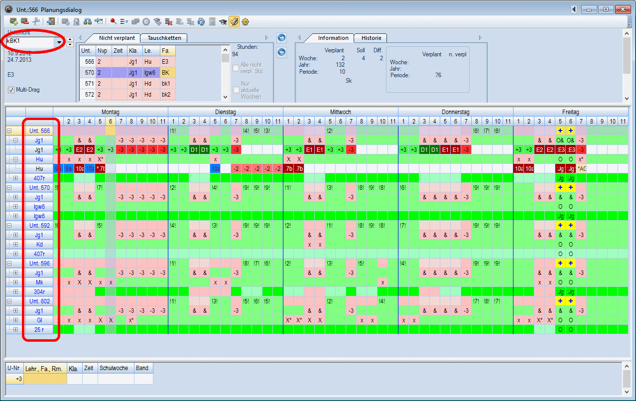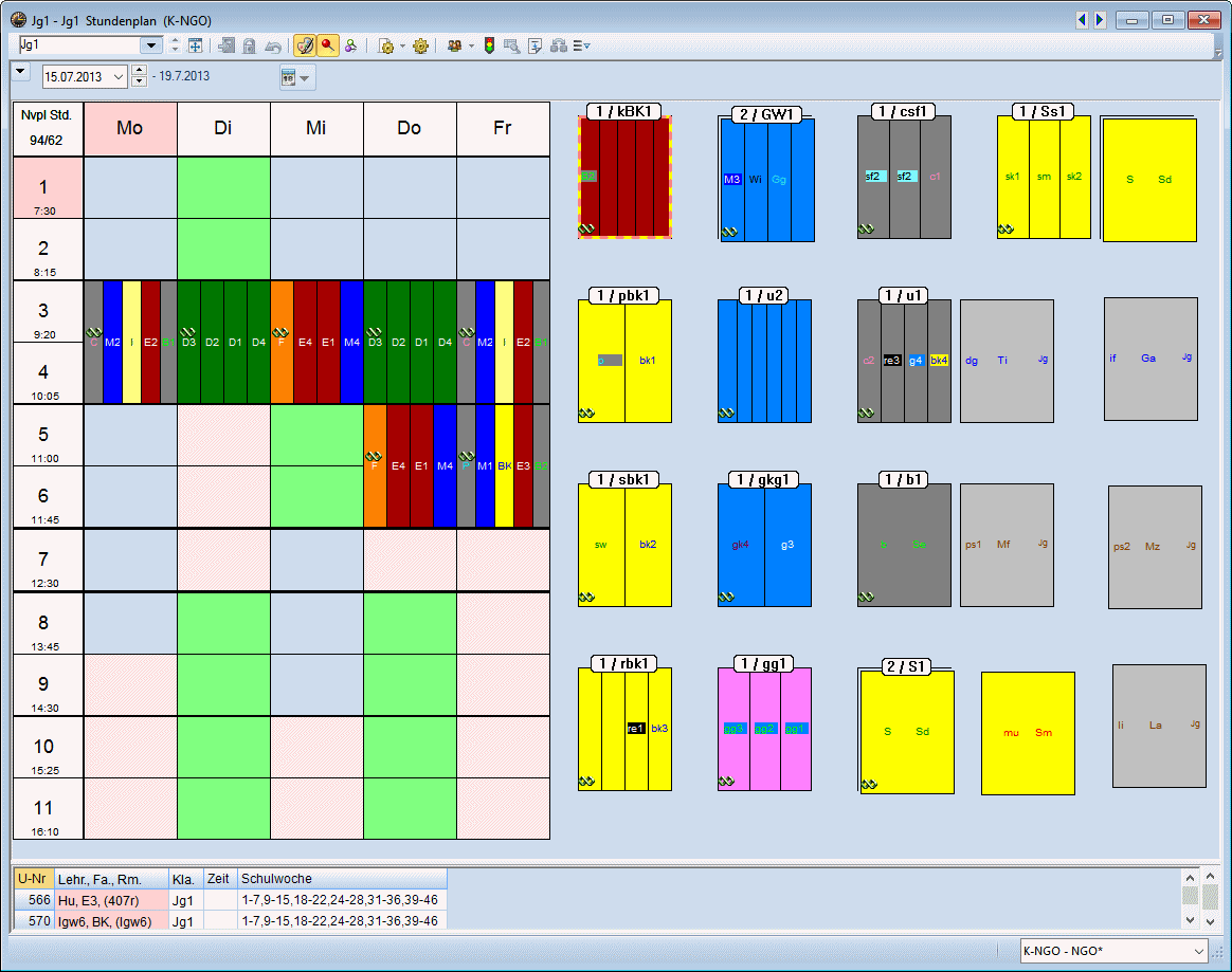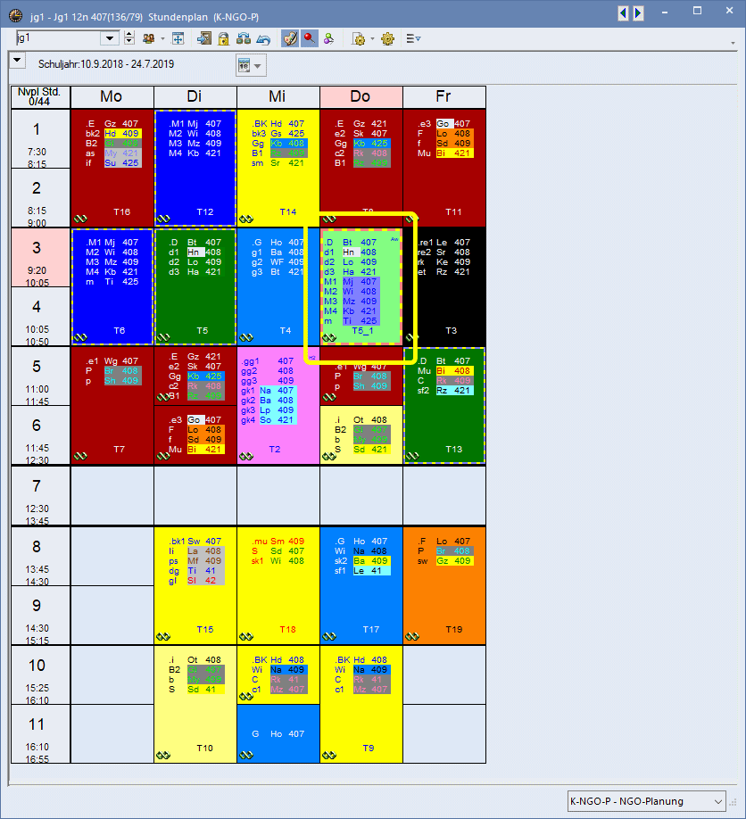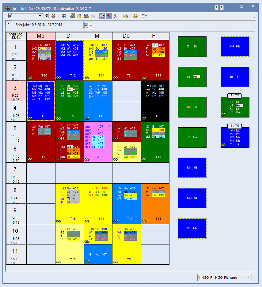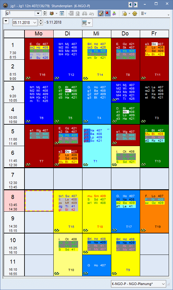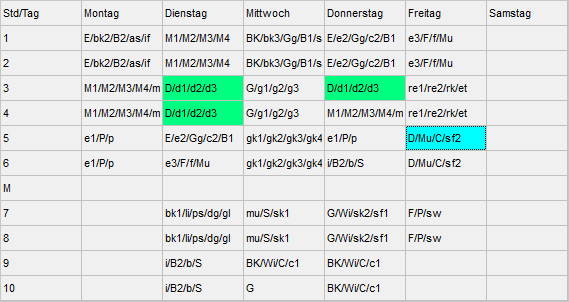 Das nebenstehende Beispiel zeigt einen aus Untis eingelesenen Plan, in dem nachtäglich für die beiden 3-stündigen 100%-Bänder D und M ein MWO-Band eingerichtet worden ist.