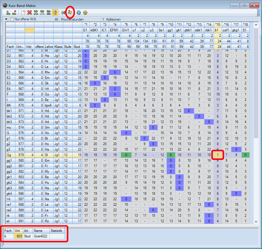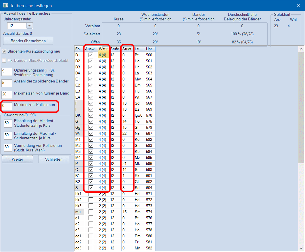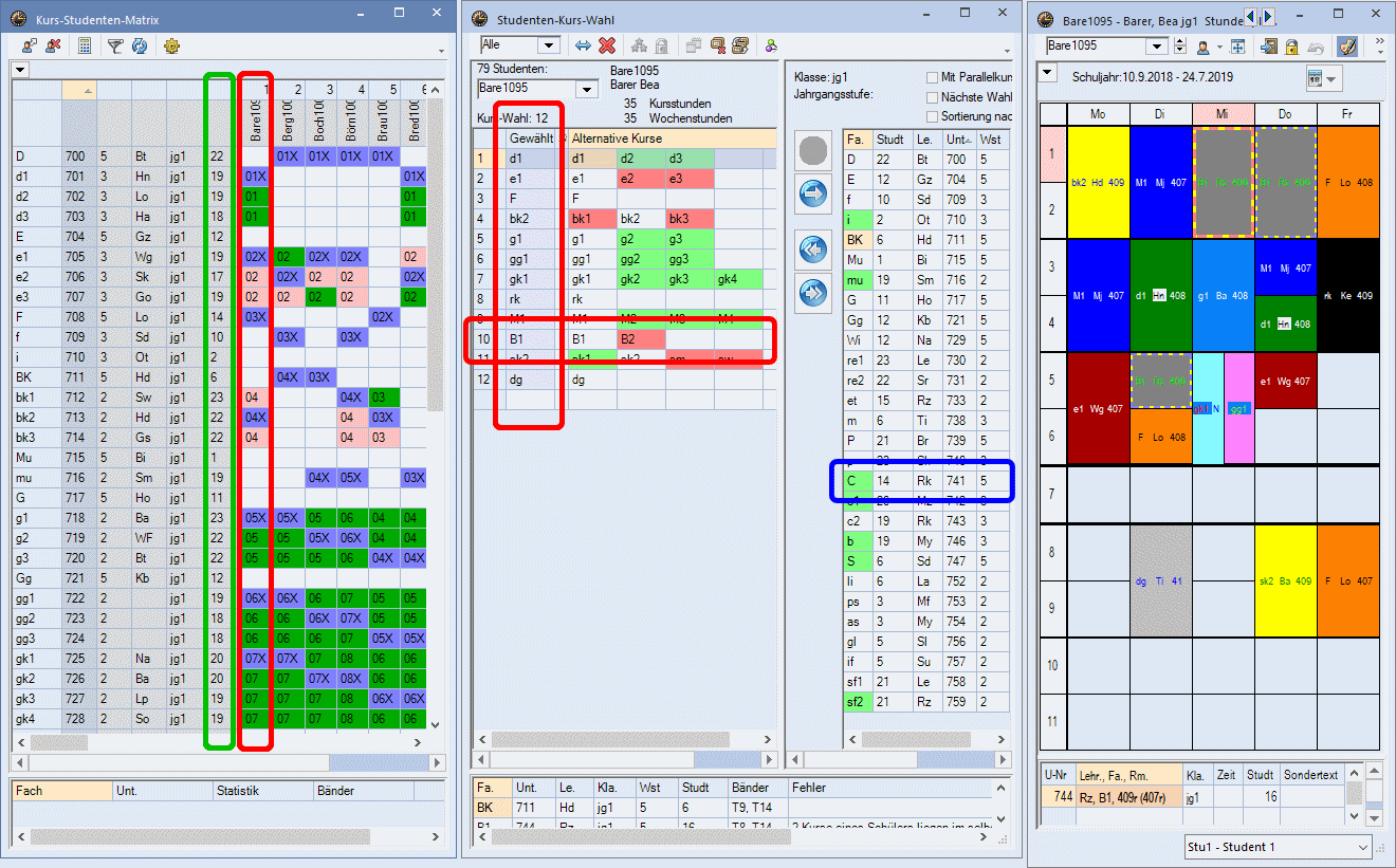In Untis erfolgen dann im Rahmen der Bandoptimierung die Einteilung in die (restlichen) Parallelkurse, ggf. Änderungen einzelner Kurslehrer, die Verplanung im Wochenstundenplan und die Raumzuweisung. Alle hier errechneten/gesetzten Kursdaten müssen anschließend zurück nach winprosa übertragen werden. Details siehe in