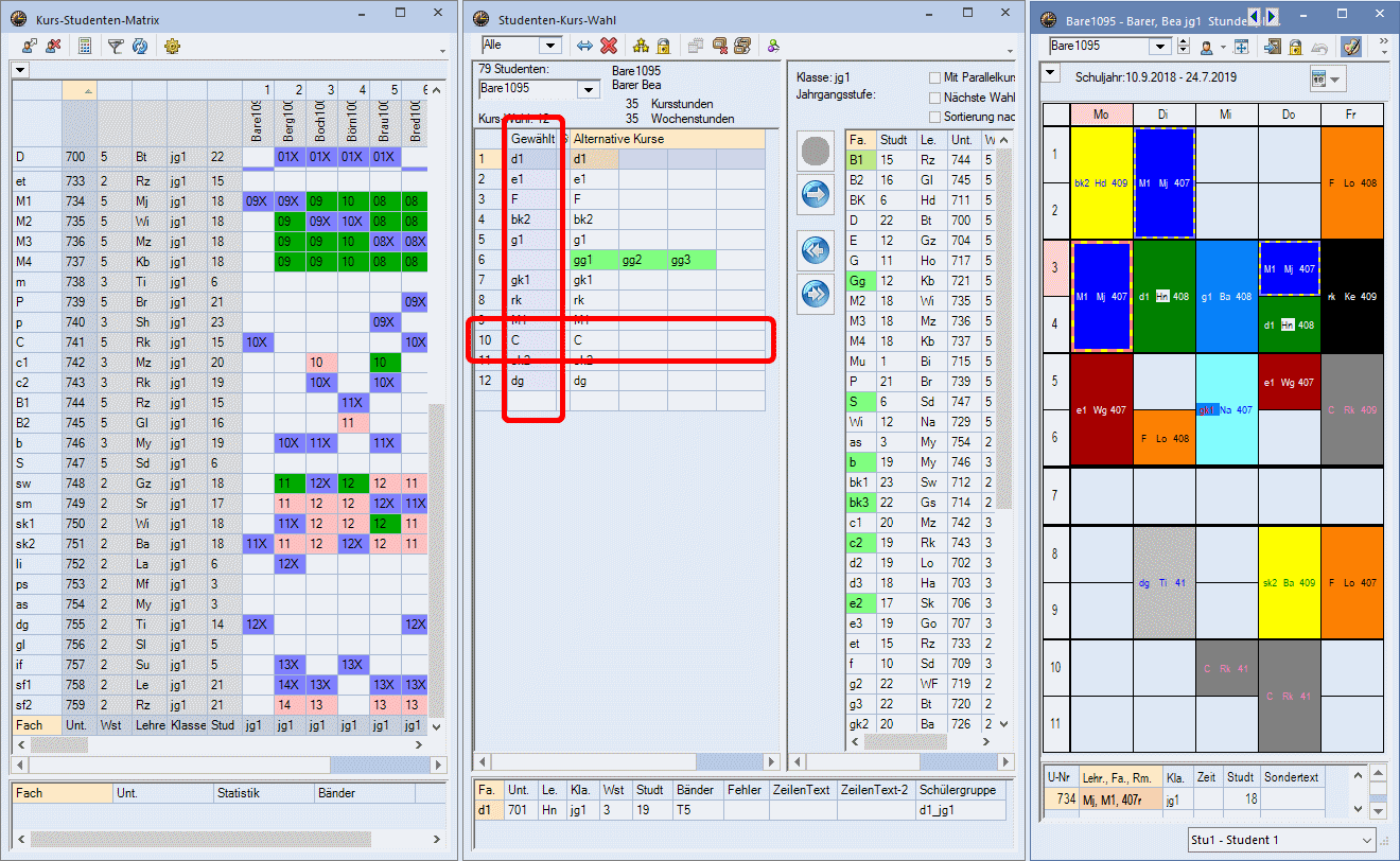 In beiden Optimierungsarten werden Bänder erzeugt, die gleich in einen Stundenplan integriert werden können (von Hand oder automatisch per Stundenplanoptimierung), wobei die weitreichenden Planwerkzeuge und Diagnosemöglichkeiten von Untis voll zum Tragen kommen. Für jeden Kursschüler (= Student) ist dann dessen Individualstundenplan ausdruckbar.