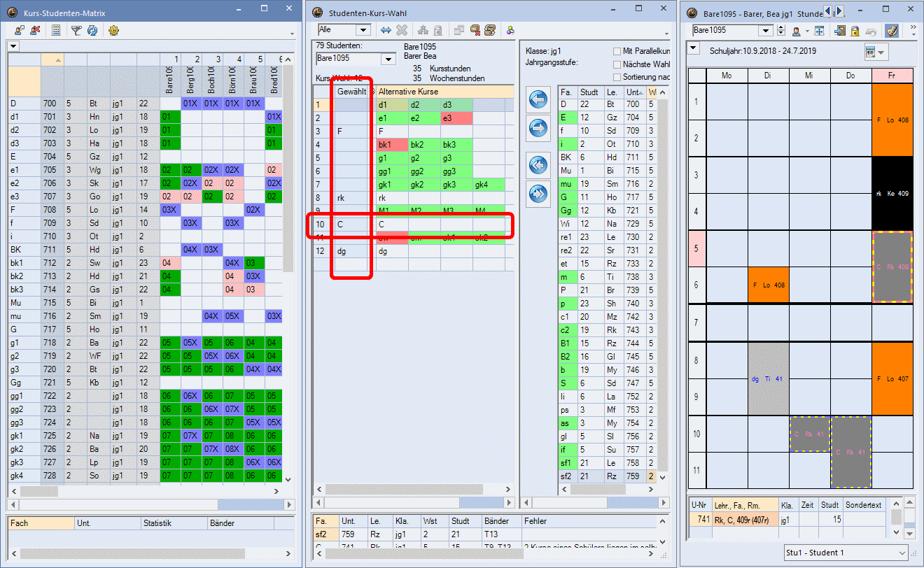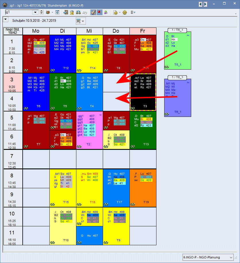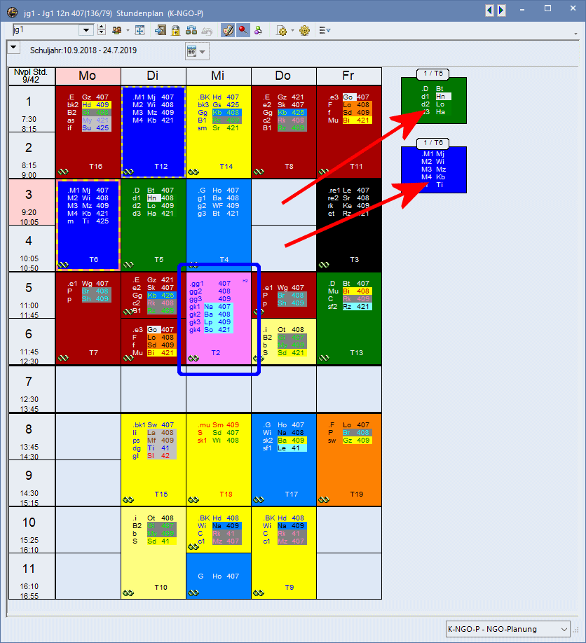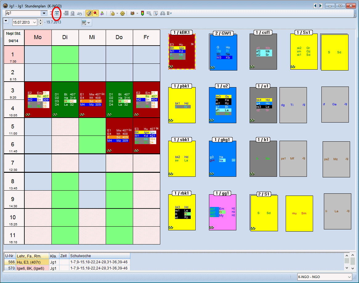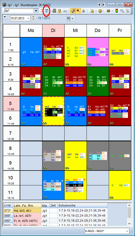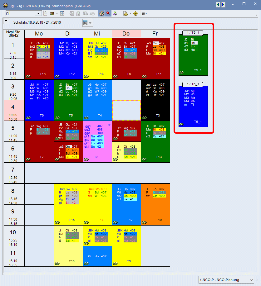 Nebenstehend ist ein Schülerstundenplan dargestellt (s.r.), der aus dem ursprünglich aus Untis eingelesenen Jahrgangsstundenplan stammt, ergänzt um das eben angesprochene MWO-Band (rot gekennzeichnet).