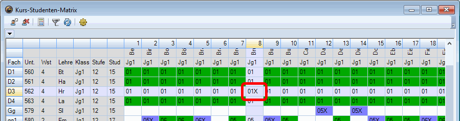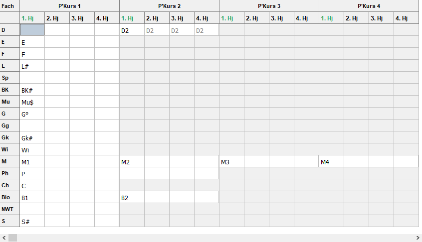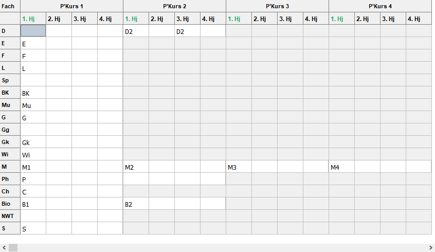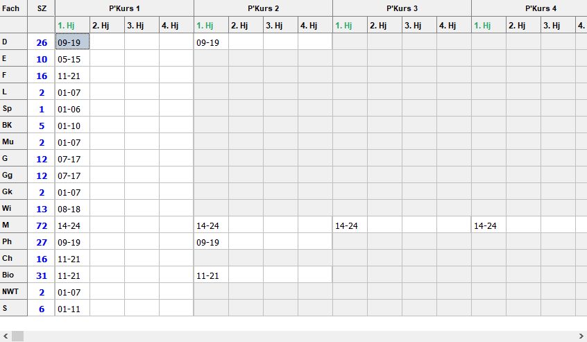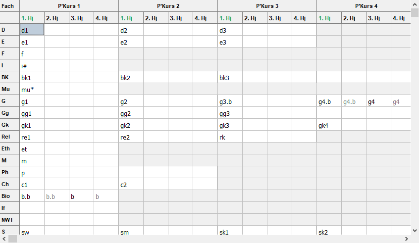 Da für die beiden Jahrgänge nur das jeweils erste Halbjahr erfasst wird, also Jg1 1.Hj. und Jg2 3. Hj., müssen Sie die Parallelkurseinteilung noch auf die jeweiligen Folgehalbjahre übertragen, wie in