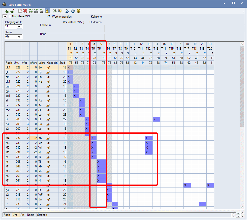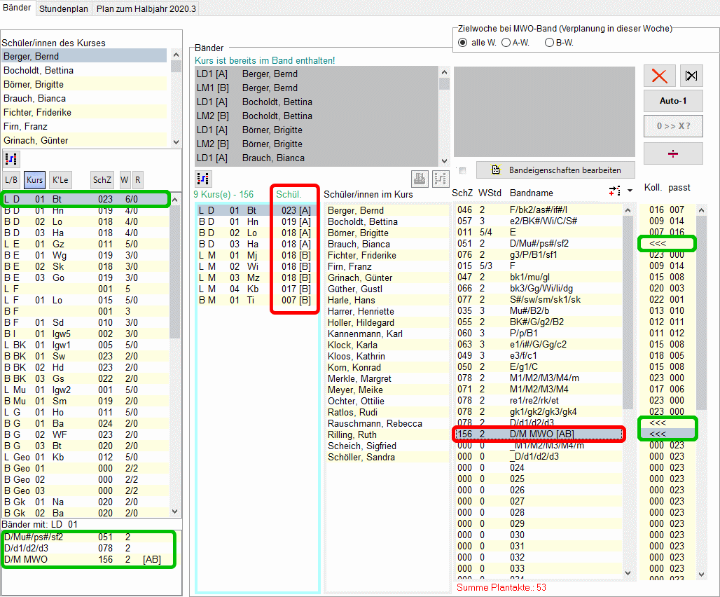 In Kapitel 3.2 wurden D- und M-Band diskutiert und es wurde problematisiert, dass nicht immer beide möglich sind. Wenn sie trotzdem erzwungen werden, wird der Rest manchmal deutlich schlechter, was die 100%-Bilanz anbelangt. Derartige Fachbänder lassen sich aber wie im Klassenverband mit Schülern beschicken, sind also ein Ersatz für diesen (mit dem Zusatz der Gleichzeitigkeit).