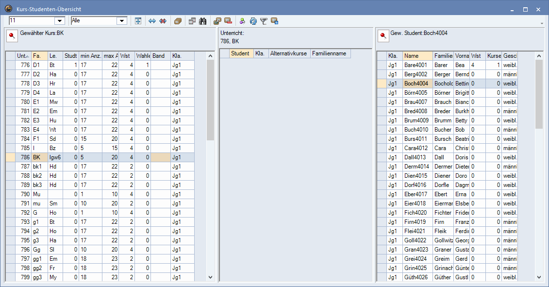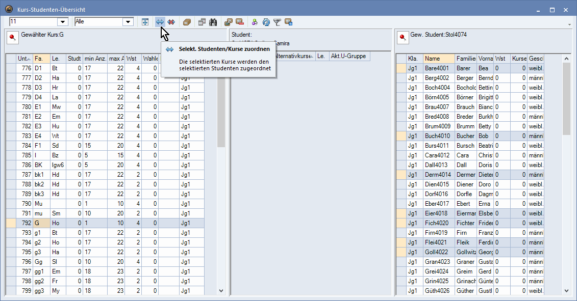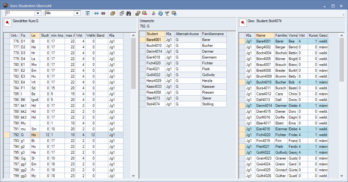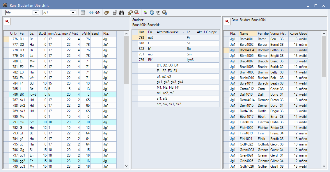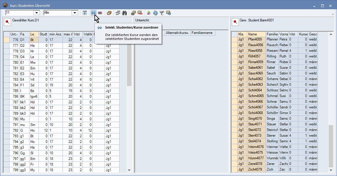 Im Dienst Start > Klassen ∨ > Unterricht wählen Sie Jg1 aus und sehen dann die eben importierten Kurse (s.l.u.). Im Dienst Kursplanung > Studenten sehen Sie dann Ihre Schüler (s.r.u.).