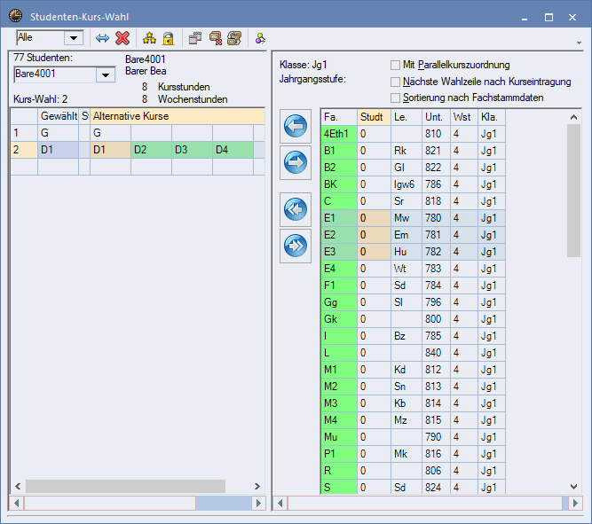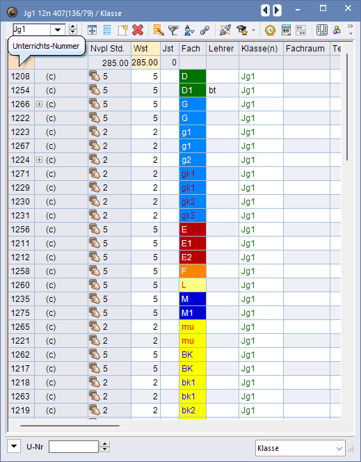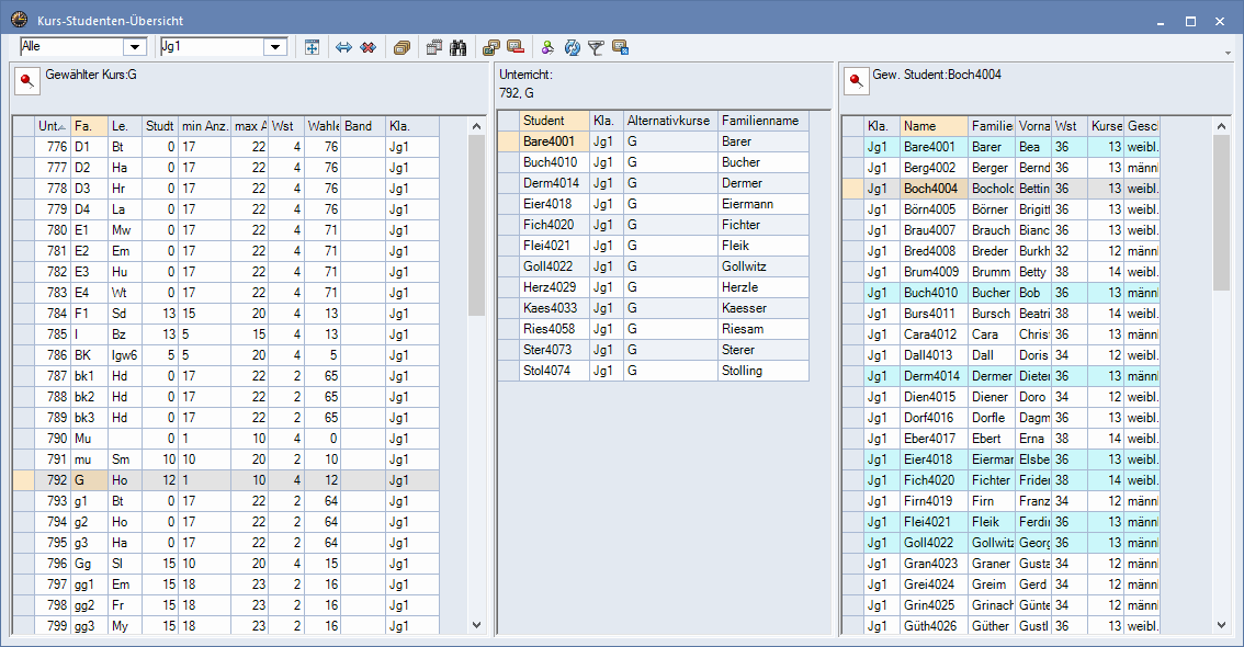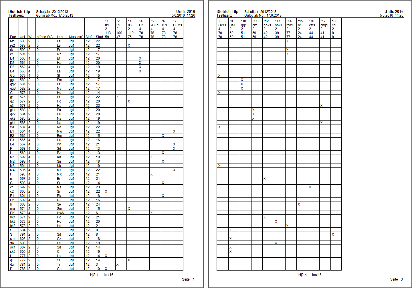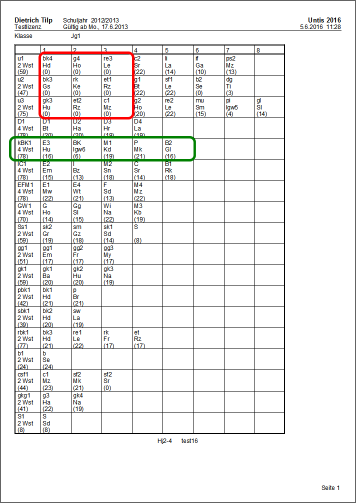 Bei richtiger Einstellung erhalten Sie so die Parallelkurseinteilung samt Kurslehrkräften für Jg1 1. Hj. bzw. für Jg2 3. Hj.