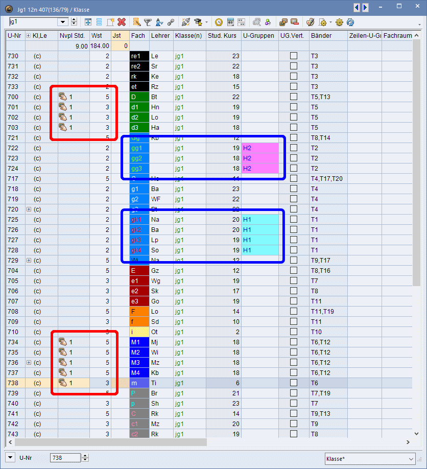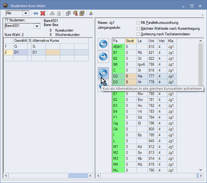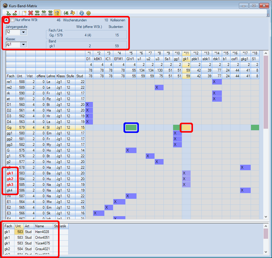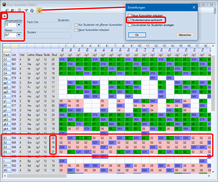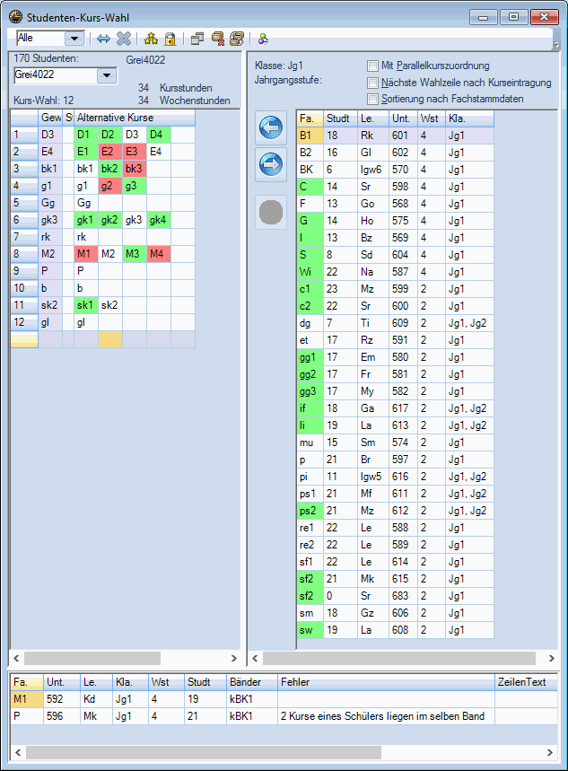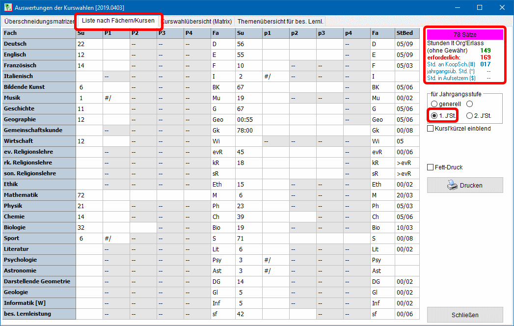 Bei richtiger Einstellung erhalten Sie so die Parallelkurseinteilung samt Kurslehrkräften für Jg1 1. Hj. bzw. für Jg2 3. Hj.