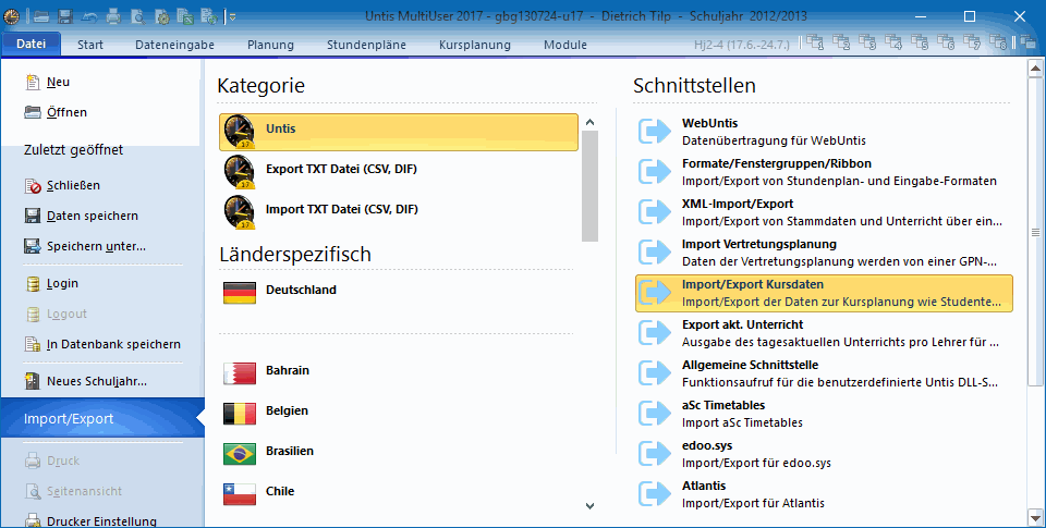 Die Schnittstellendatei gpwinprosa.txt erzeugen Sie in Untis über Datei > Import/Export > Deutschland | Bad.Württ. Winprosa und lesen diese dann in winprosa auf der Karteikarte Import von gp-Kursplanung ein (s.r.u.).