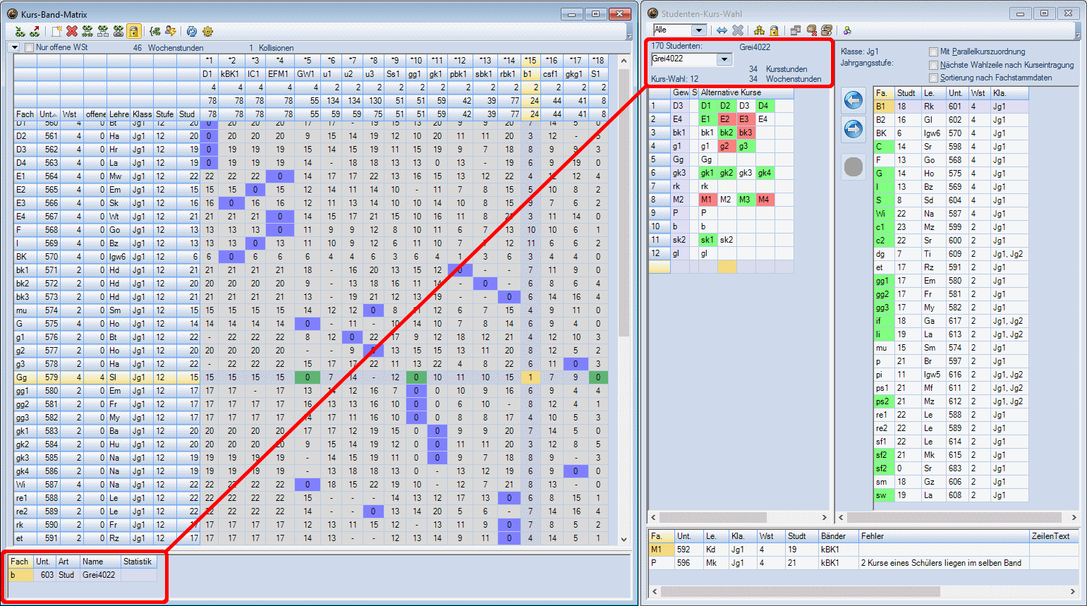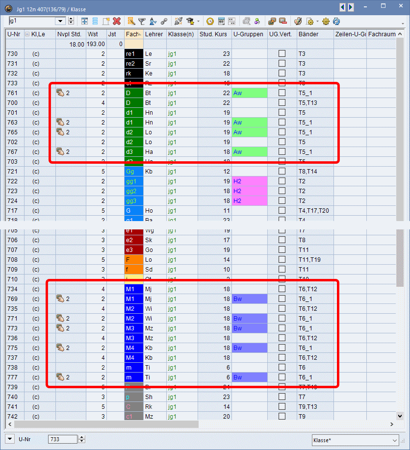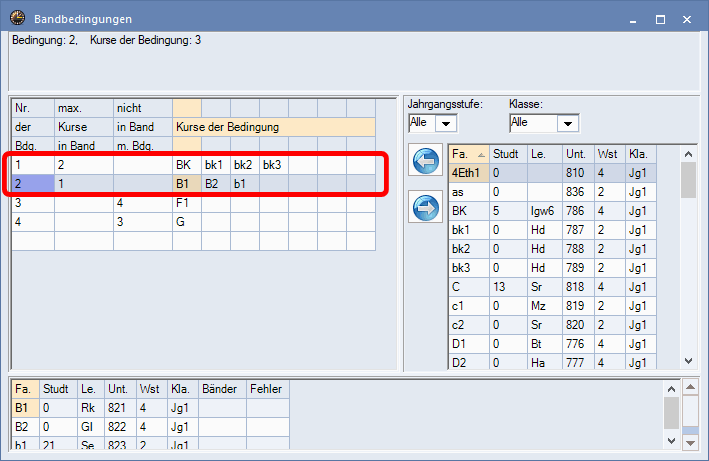 Gekoppelter Unterricht bezieht sich also auf eine einzelne oder wenige zusätzliche Klassen. - Bänder bestehen ebenfalls aus gleichzeitig stattfindenden Unterrichten, aber die sind nun Kurse, d.h. bei denen ist jeweils zusätzlich bekannt, welche einzelnen "Studenten" pro Kurs beteiligt sind.