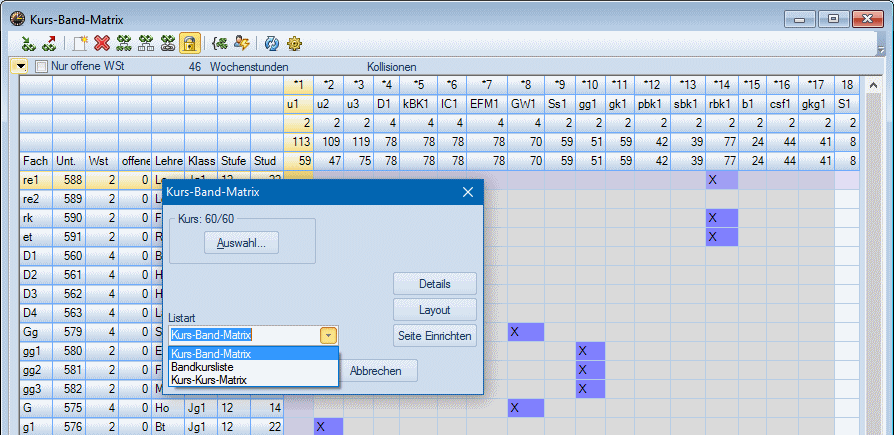 Grün gekennzeichnet und aktiviert ist in der Kursliste der Kurs LD. Unter der Kursliste sind die drei 2-stündigen Bänder mit LD aufgeführt, dabei ist das MWO-Band, erkenntlich an der Periodenbezeichnung [AB]. In der Kollisionszählerspalte sind diese drei Bänder für die nebenstehende Bändertabelle gekennzeichnet.