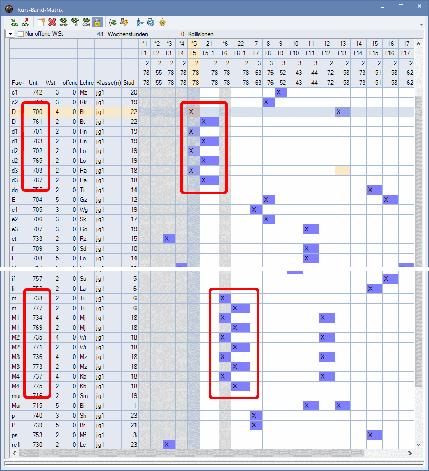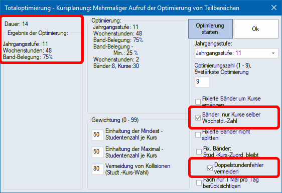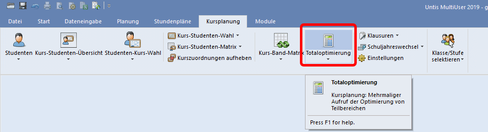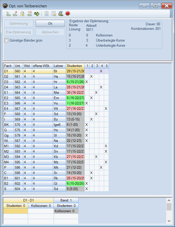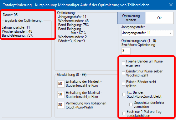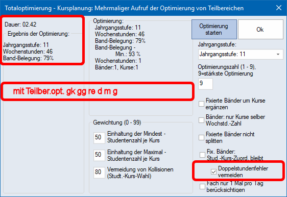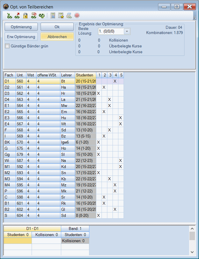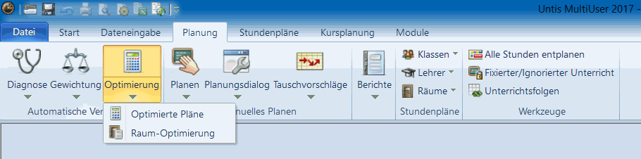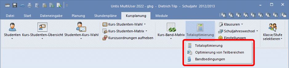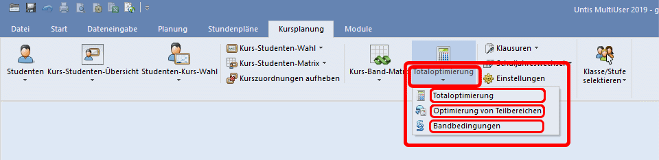 Totaloptimierung und Teilbereichsoptimierung sind nicht zu verwechseln mit der Stundenplanoptimierung von Untis; aber die Stundenplanoptimierung kann die im Kursplanungsmodul erzeugten Bänder im Stundenplan setzen.