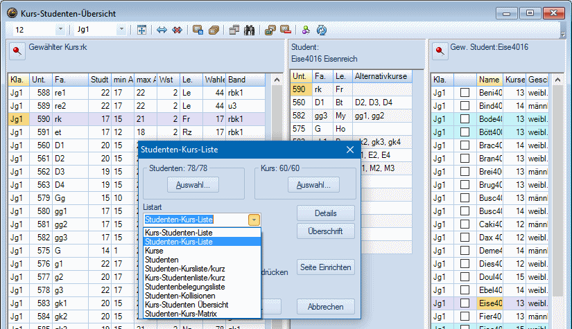 Möglich ist die Übertragung des Kursangebots und der "Studenten" samt Kurswahlwünschen "in einem Rutsch" nach Untis. Dabei können feste Parallelkurszuweisungen mitübertragen werden, die von Untis nicht mehr geändert werden (mehrheitlich für Jahrgangsstufe 2 nötig), als auch offene Parallelkurseinteilungen (mehrheitlich für Jahrgangsstufe 1 nötig).