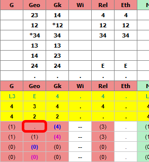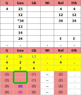 In den nebenstehenden Bsp. sind drei derartige Fälle rot markiert. Wenn die Daten aus Untis importiert werden, kommen die Fehlermedungen, dass bei den entsprechenden Schülern keine Belegung in Geo, Sport oder Seminarfach gefunden worden seien. Folglich konnten zunächst keine Parallelkurszuweisungen übernommen werden, erst Recht nicht für das 2. Hj.