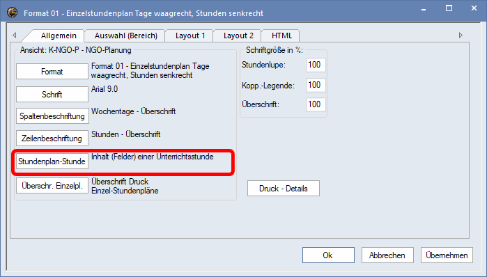 Wenn z.B. ein 5-stündiger Kurs in zwei Doppelstunden und einer vierzehntäglichen A/B-Wochen-Doppelstunde gegeben werden soll, kommt der Kurs im Wochenplan 6-stündig vor, soll aber weiterhin beim Schüler nur 5-stündig zählen. Daher muss die Plantaktanzahl für diesen Kurs auf 6 erhöht werden; die Wochenstundenanzahl bleibt ungeändert.