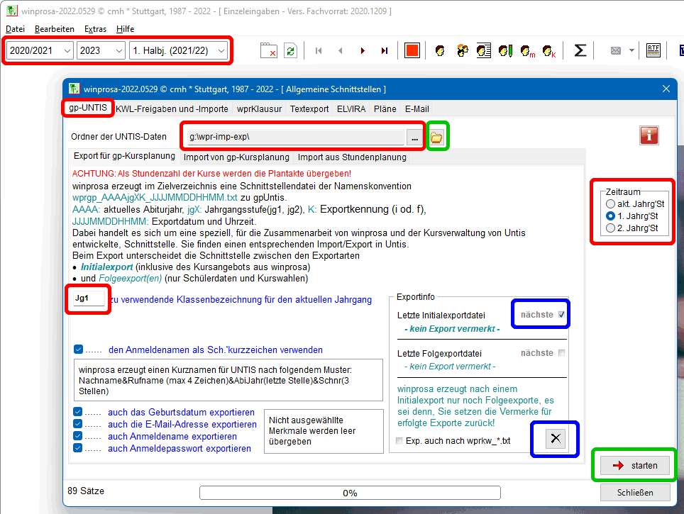 Wählen Sie die Karteikarte Export für gp-Kursplanung und sorgen dort für die weiteren rot markierten Einträge.