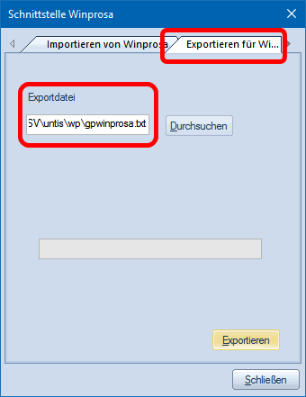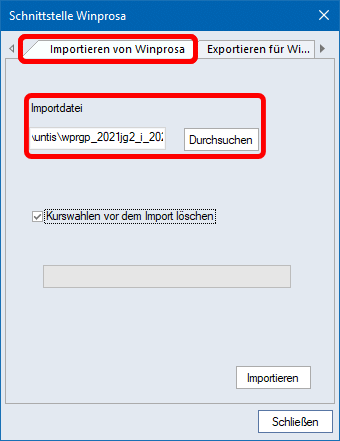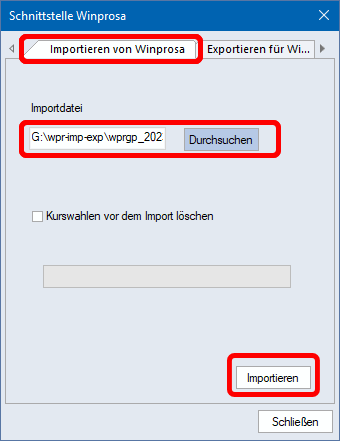 Wählen Sie im zugehörigen Fenster die Karteikarte Importieren von Winprosa auf (s.r.) und wählen dort mittles Durchsuchen im Import-Export-Ordner die eben erzeugte Importdatei aus. Starten Sie den Import.
