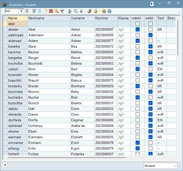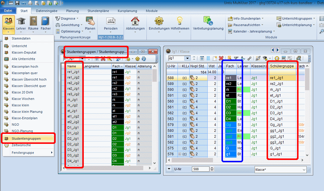 Schülergruppen (= Studentengruppen) werden in WebUntis bei geteilten Unterrichten z. B. für das Klassenbuch und für die Schülerstundenpläne benötigt. Sie dürfen nicht mit den in diesem Text beschriebenen Band-Kursen verwechselt werden, obwohl jedem Kurs automatisch ein Schülergruppen-Name zugewiesen wird. Auch die in Untis möglichen Klassengruppen bleiben hier ohne Berücksichtigung.
