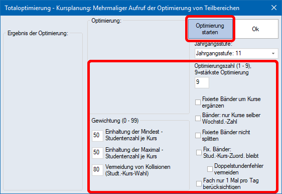 Die Optimierung von Teilbereichen erlaubt auf einfache Weise die Beeinflussung des Ergebnisses (z.B. welche Kurse müssen in einem gemeinsamen Band sein, welche dürfen nicht gemeinsam unterrichtet werden). Allerdings fällt das sinnvolle Einteilen von Teilbereichen u.U. dann schwer, wenn es nicht so klar erfolgen kann, wie in BW mit der NGVO 2010. Daher ist in Untis die Totaloptimierung vorhanden, die u.a. ggf. selbst Teilbereiche festlegt und dann intern mehrfach die Optimierung von Teilbereichen startet. Die Totaloptimierung ist recht erfolgreich für die AGVO 2021 in BW einsetzbar.