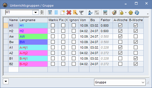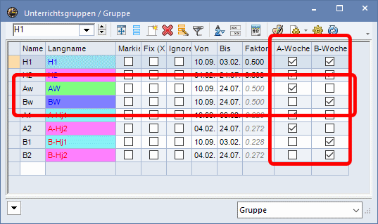 Unabhängig davon, ob Sie Bänder mit A/B-Wochen oder Quartalen o.ä. verplanen wollen, können Sie aus Untis nur Daten erhalten, die ohne diesbezügliche Unterrichtsgruppen erstellt worden waren. winprosa kann auch nur solche Daten aus Untis übernehmen.