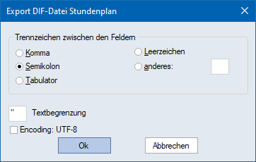Die Stundenplandatei GPU001.TXT erzeugen Sie in Untis über Datei > Import/Export > Export TXT Datei (CSV DIF) > Stundenplan. Wählen Sie dabei als Trennzeichen zwischen den Feldern das Semikolon. Anschließend lesen Sie diese Datei in winprosa ein auf der Karteikarte Import aus Stundenplanung (s.r.).