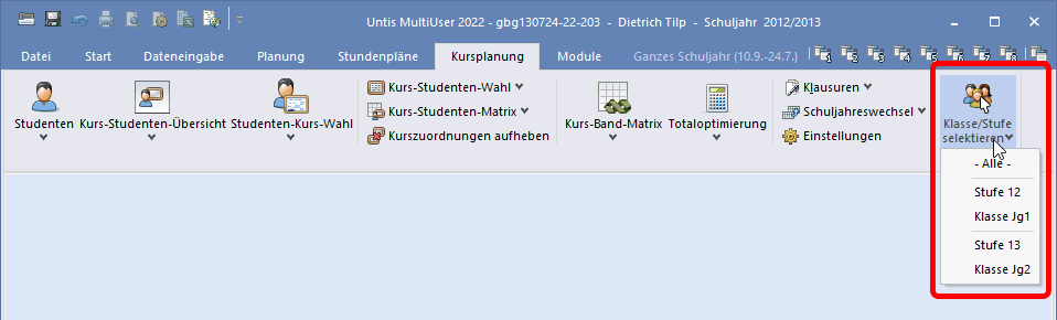 Falls Sie ausnahmsweise keine Schüler sehen, hat jemand in Untis bereits einige Parameter für die spätere Arbeit angepasst. Prüfen Sie dann, ob im Dienst Kursplanung > Klasse/Stufe selektieren ∨ der Wert -alle- eingestellt ist.