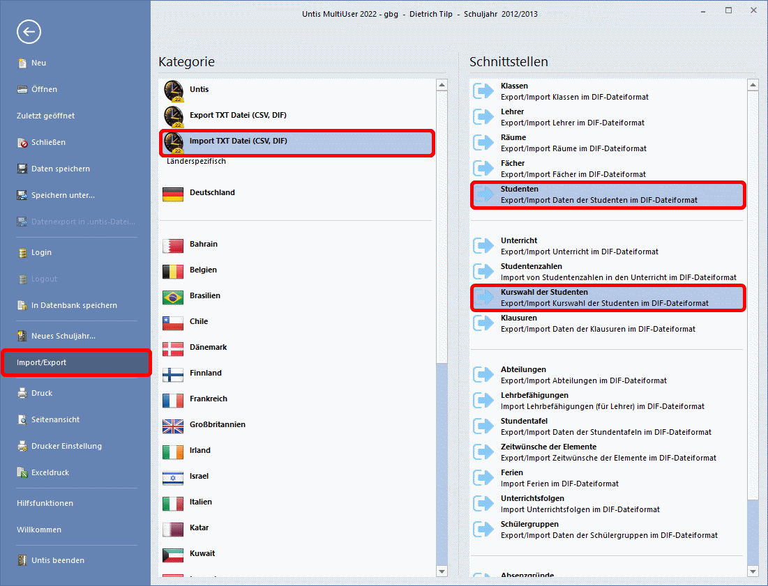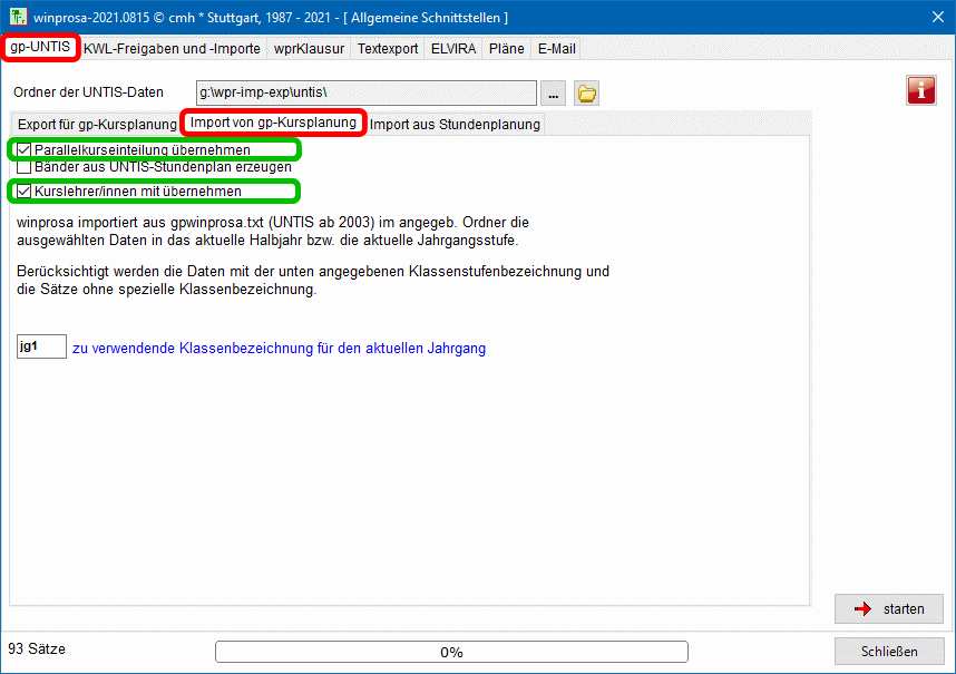 winprosa-Schulen bietet Untis seit Version 2003 eine bidirektionale Datenschnittstelle zu winprosa (Aufruf s.r.; rot markiert, Layout ab Untis 2015). Somit brauchen in Untis keine Kurse und keine Studenten samt Kurswahl mehr erfasst zu werden.