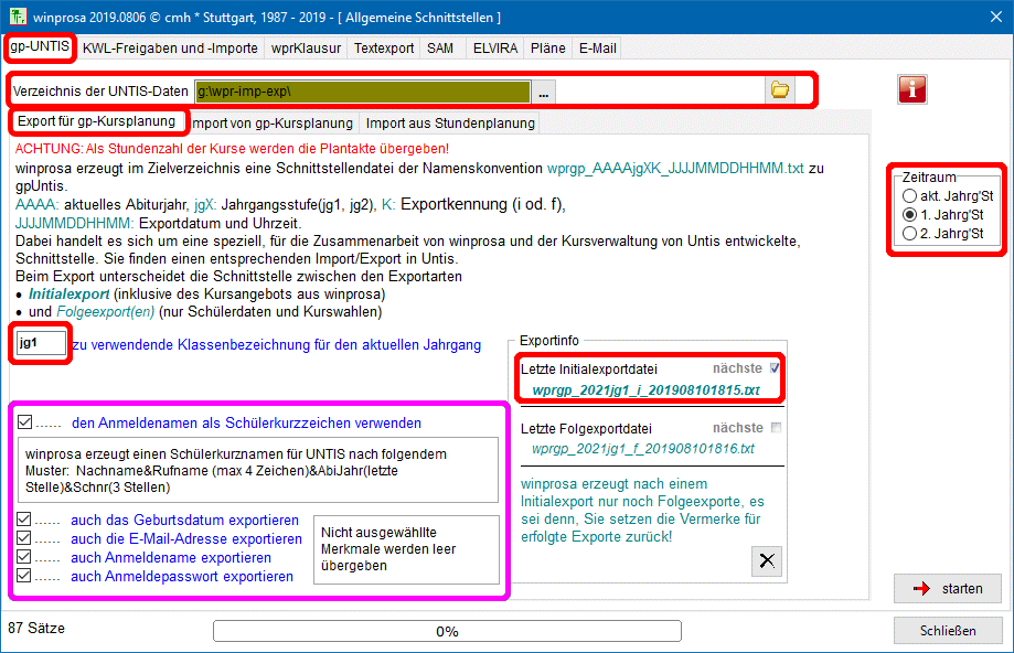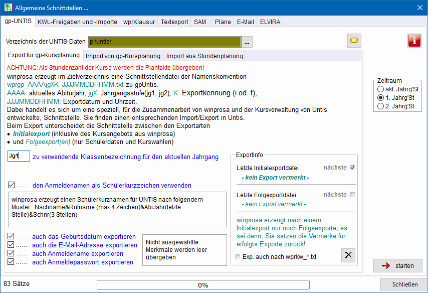 Untis erzeugt immer eine gemeinsame Datei gpwinprosa.txt für die gesamte Kursstufe (also für beide Jahrgangsstufen). Aber diese Datei kann nur erstellt werden, wenn dort der Kursplanungsmodul lizenziert ist. gpu001.txt kann immer erstellt werden.