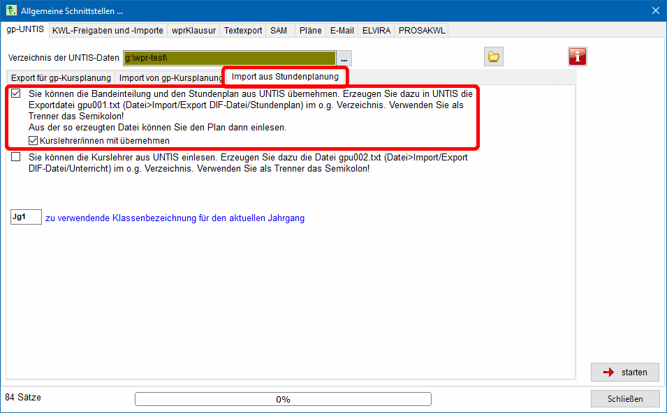 Eigentlich könnte winprosa dort auch den Stundenplan entnehmen. Das klappt aufgrund eines Designfehlers bei der damaligen Schnittstellenabsprache aber nur, wenn in Untis nicht bereits beide Jahrgänge vorhanden und ggf. mit jahrgangsstufenübergreifenen Kursen besetzt sind. Abhilfe schafft die Datei GPU001.TXT.