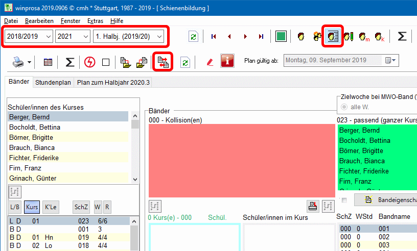 Daher müssen Sie in winprosa im Dienst Bearbeiten > Planungsarbeiten jeweils zuerst den entsprechenden Jahrgang und das Halbjahr auswählen (s.r.; rot markiert).
